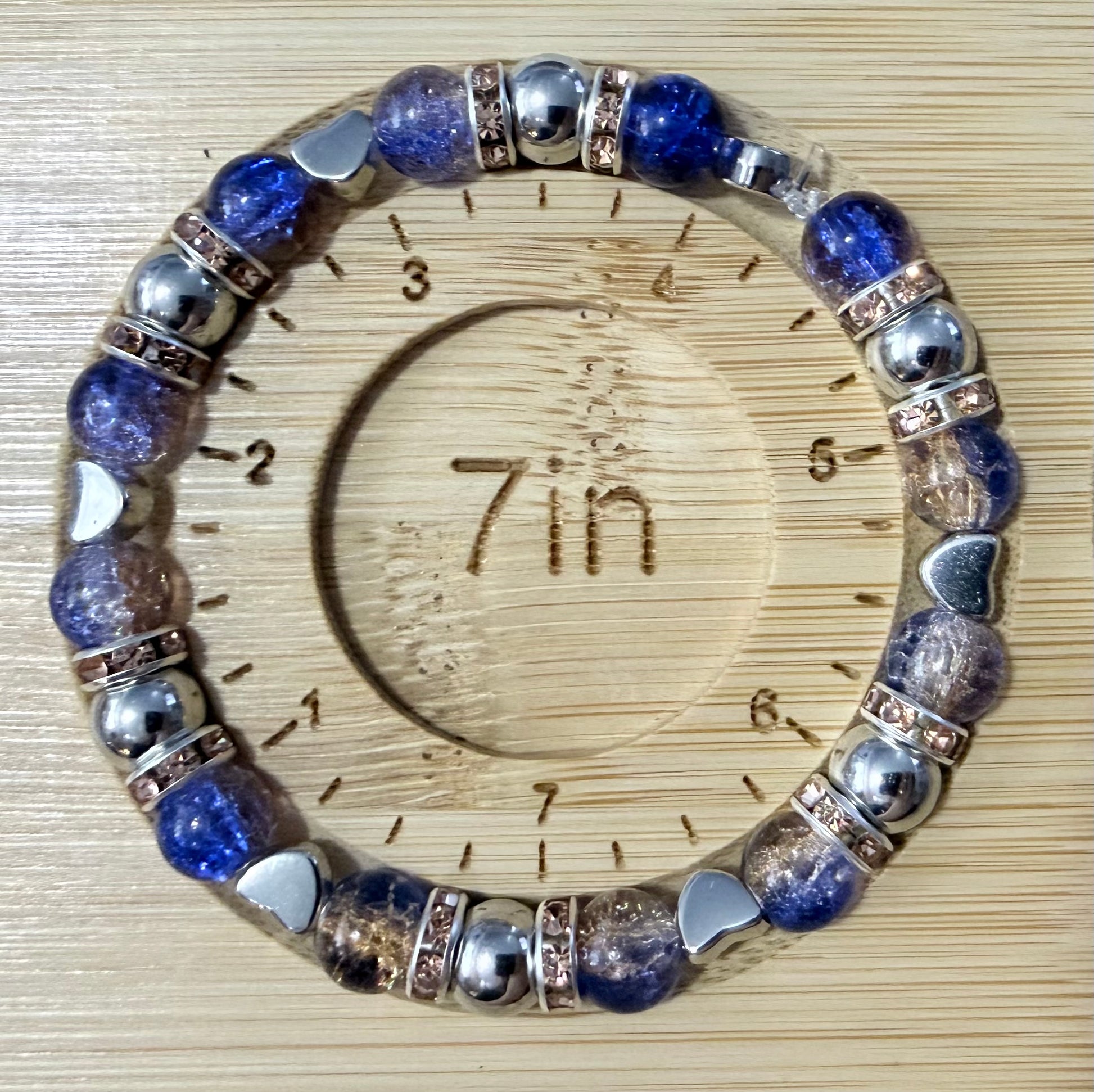 This bracelet is made of glass beads and metal accents. the accents are a spacer and heart shaped metal. The glass beads are crackle blue and goldish blend. This is a stretchy cord bracelet for ease of use and comfort.
